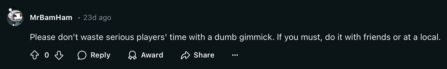 That said, I’m probably not going to actually do this. The best candidates so far just aren’t fun enough to justify playing them for a whole regional tournament (a legitimate point that some people did make in the thread). Someone on the sub suggested to maybe do it to a local event before rotation, and I think that’s probably right.