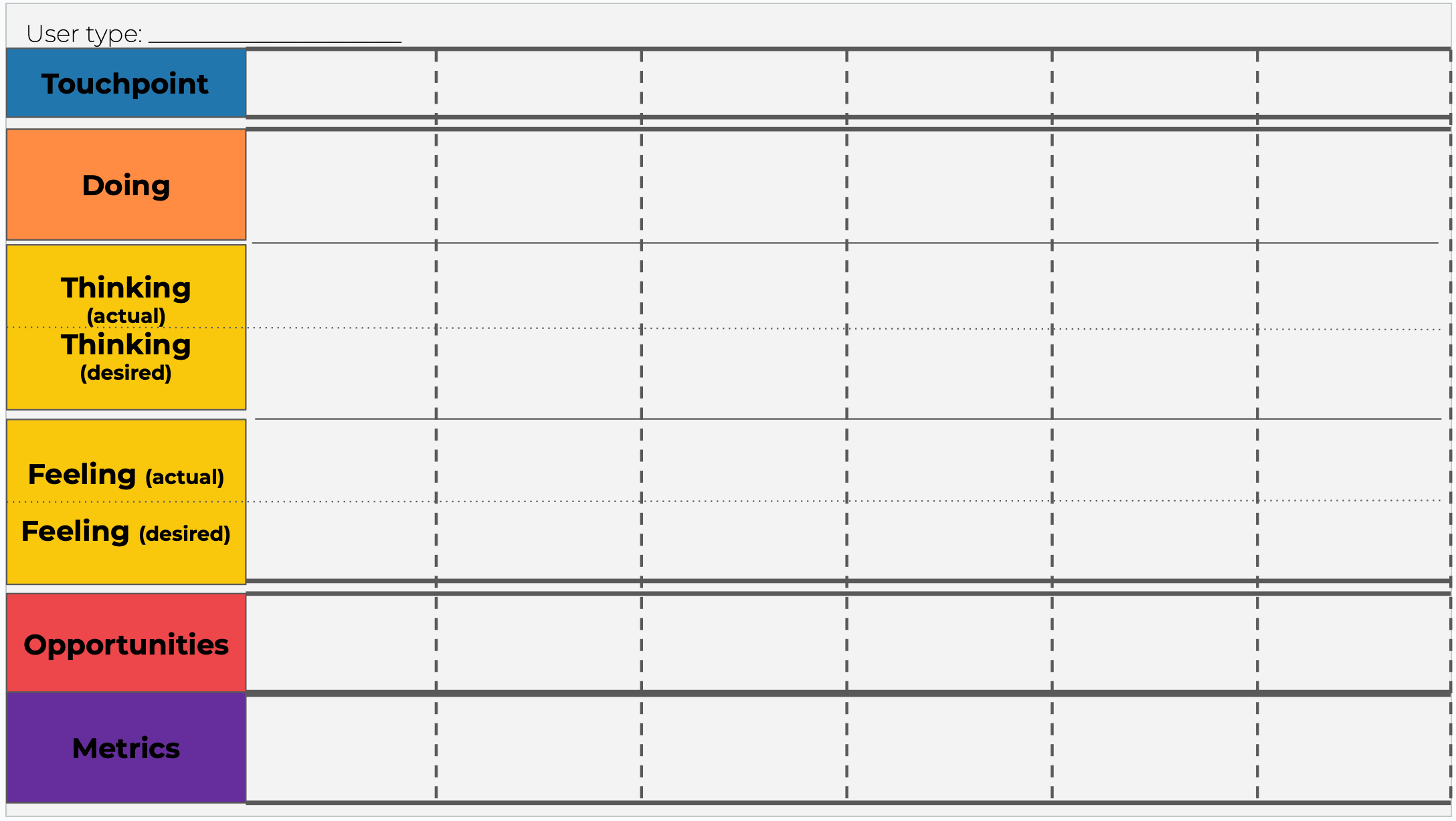 Nonetheless, a bit of deliberateness and intentionality can go such a long way, so I want to share my very basic experience map template. (I’m gonna be honest - I don’t actually love Google Slides for this, but for doing it the first time it can be intimidating to do on a new tool like Miro. But if you’re the kind of person who wants a Miro template for this, hit me up & I’ll share one.)