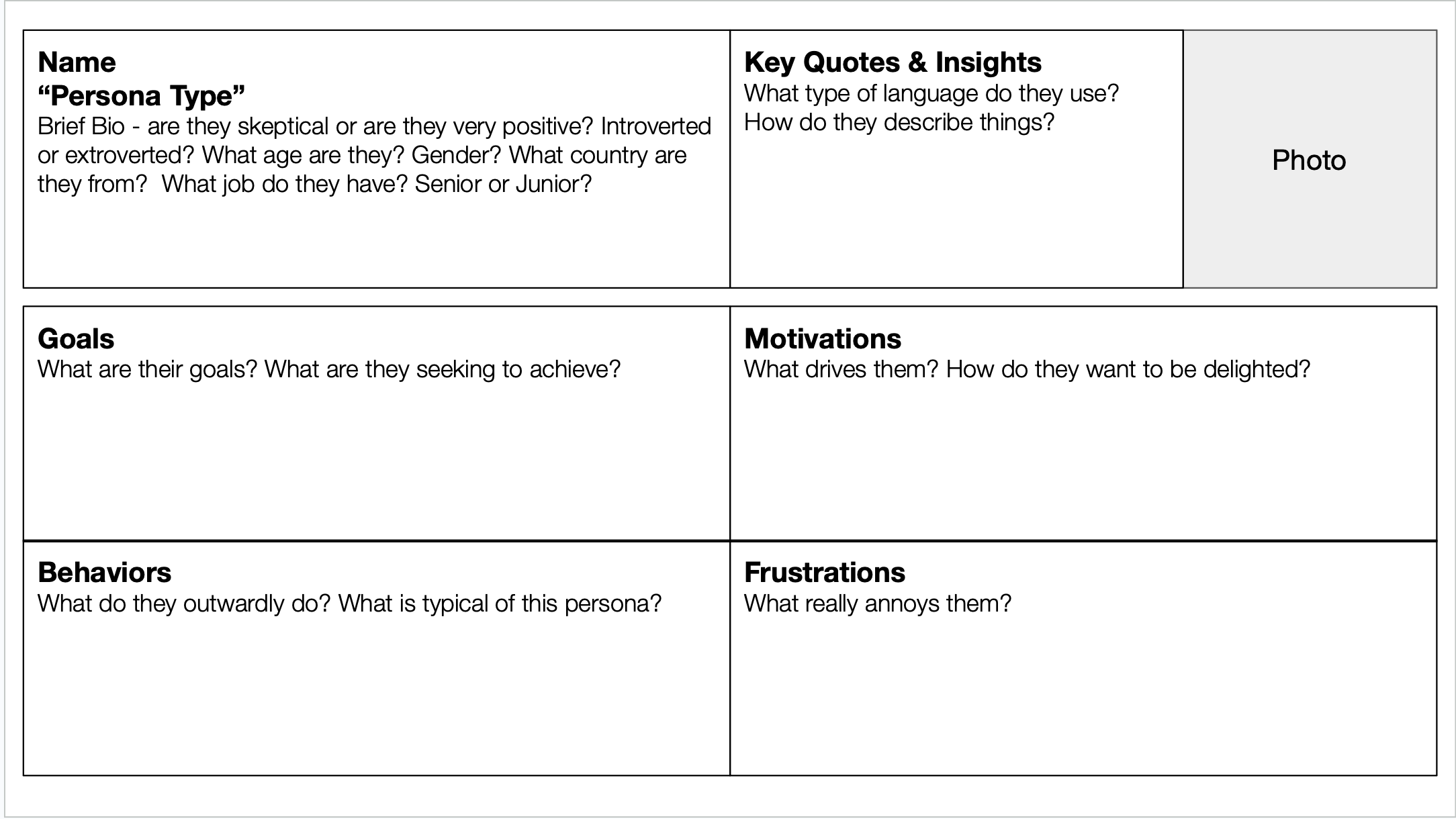 - who is the “user persona” - essentially, who is directly experiencing this problem. You can build a pretty simple but rich user persona using this template.